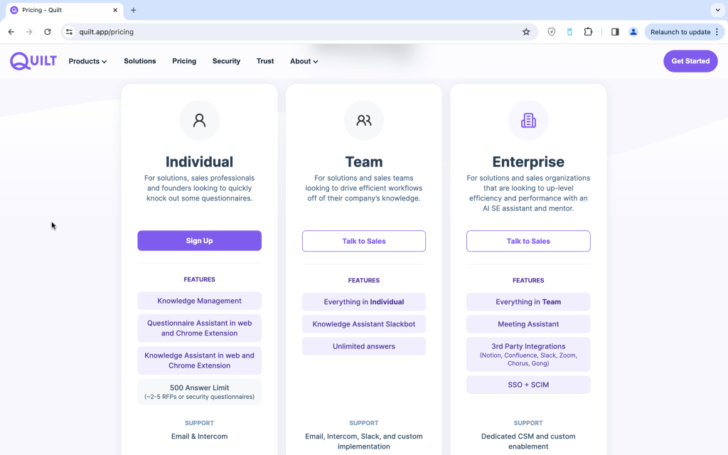 Quilt would try to target solution and sales organizations. Inside these clients, they consider Sales Engineering representatives as relevant customers for their solution.